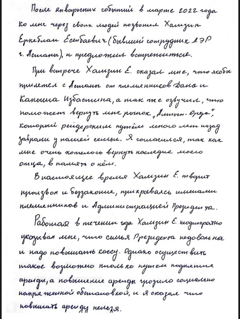 «При встрече он сказал, что якобы прилетел из Астаны от племянников Дана и Каныша Избастиных, а также пообещал, что поможет мне вернуть рынок "Алтын Орда", который рейдерским путем забрали у моей семьи много лет назад. Я согласился, так как мне хотелось вернуть наследие отца. Сейчас Хамзин творит произвол и беззаконие прикрываясь именами племянников и администрацией президента», — продолжает Альпиев.