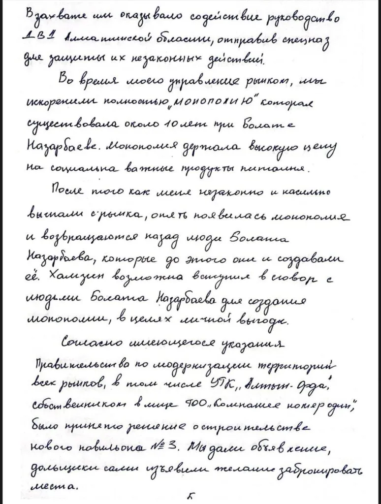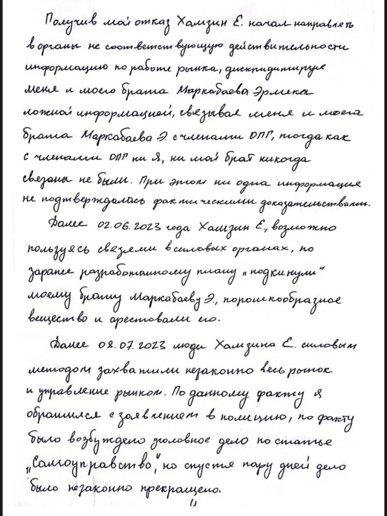 «Однако осуществить такое возможно только поднимая арендную плату, а ее повышение грозило социально-напряженной обстановкой и я сказал, что поднимать аренду нельзя. Получив мой отказ, Хамзин начал отправлять в органы не соответствующую действительности информацию по работе рынка, дискредитируя меня и моего брата Эрмека Маркабаева ложной информацией, связывая нас с членами ОПГ, тогда как мы никогда с ними связаны не были. При этом ни одна информация не подтверждалась фактическими доказательствами».