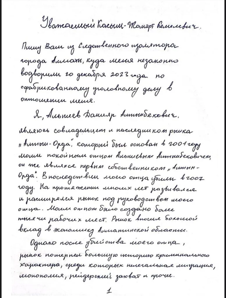 «Я являюсь совладельцем и наследником рынка "Алтын Орда", который был основан в 2021 году моим отцом Алтынбеком Альпиевым. Он же являлся первым собственником. В 2007 году моего отца убили. На протяжении многих лет рынок расширялся и развивался под руководством моего отца. Было создано более тысячи рабочих мест. Однако после убийства моего отца рынок потерпел большую историю криминального характера среди которых нелегальная миграция, монополия, рейдерский захват и прочее. Именно путем незаконного захвата рынок долгое время принадлежал Болату Назарбаеву», — пишет Альпиев.