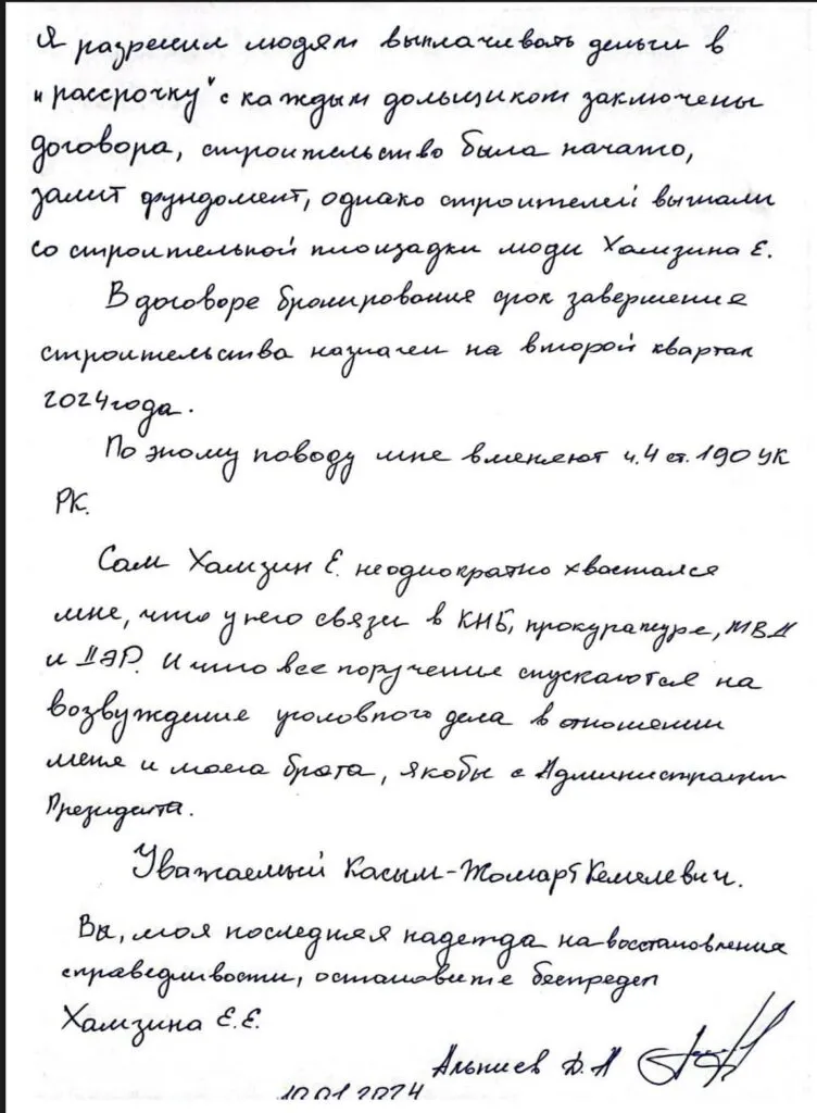 «Вы моя последняя надежда на восстановление справедливости, остановите беспредел», — обращается к Токаеву бизнесмен в конце своего письма.
