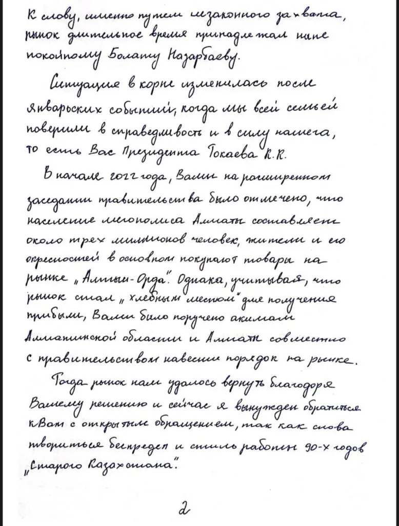 «Однако учитывая, что рынок стал «хлебным местом» для получения прибыли, вы поручили акимам Алматы и области совместно с правительством навести порядок на рынке. Тогда рынок нам удалось вернуть благодаря вашему решению и сейчас я вынужден обратиться к вам с открытым обращением, так как снова творится беспредел и стиль работы 90-х годов «старого Казахстана», — пишет Альпиев.