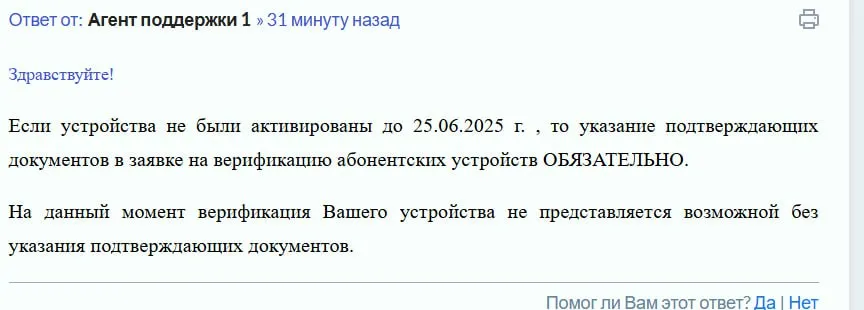 Такой момент настал как раз в августе. По словам Ильясова, он знал о введении верификации, но его ничего не смутило, поскольку телефон он купил легально – все чеки на него и гарантия есть. Тем более во всех пояснениях Минцифры было указано – закон вступает в силу в мае 2025 года и распространяется на телефоны ввезенные в страну после марта 2025 года.