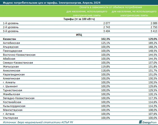 В месячной динамике цены на электричество выросли только в Актюбинской (25,1%), Жетысуской (19,8%) и Акмолинской (18,6%) областях. В остальных регионах тарифы остались на уровне предыдущего периода.