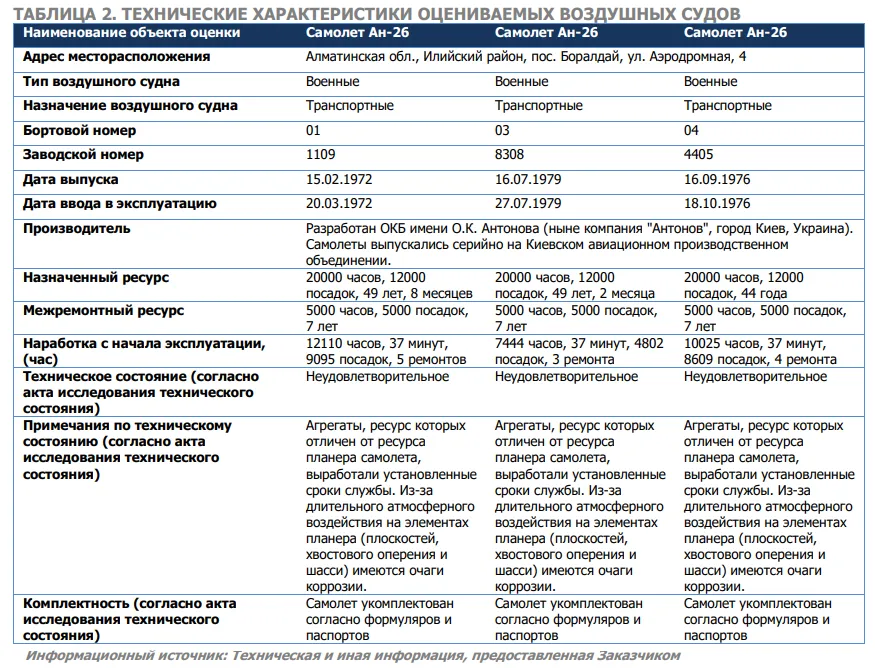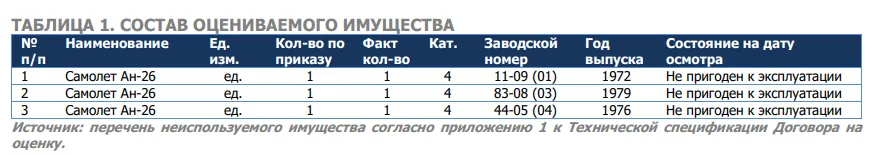 Как выяснилось в ходе оценки, самолёты не пригодны к эксплуатации. По данным оценщика, разумных перспектив продать их на рынке нет, единственный вариант реализовать "по стоимости извлекаемых материалов". В итоге оценили три АН-26 как металлолом и утиль.
