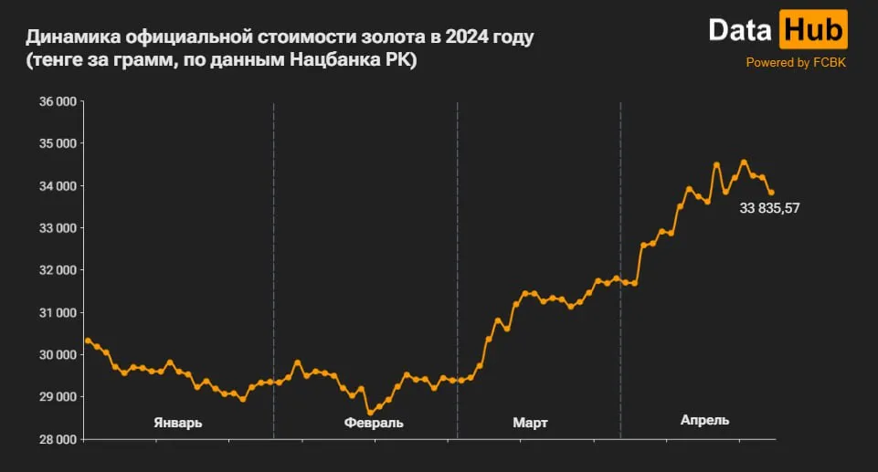 «Драгоценный металл дешевеет уже три дня подряд. Правда, прямо перед этим, 18 апреля, его стоимость достигла исторического максимума — 34 546,96 тенге за грамм. Относительно данной отметки снижение составило 2,1% — 711,39 тенге», — пишут аналитики.