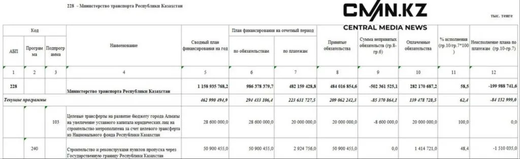 А реализовали бюджет лишь на 48,4%. В столбце "Неисполнение плана по платежам" указана сумма более 1,5 млрд тенге.