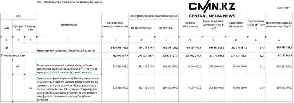 В Министерстве транспорта опубликовали отчёт о результатах мониторинга реализации бюджетных программ. Оказалось, что выделенные на строительство LRT 332 млрд тенге освоили меньше, чем на половину, передаёт CMN.KZ