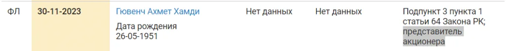 Кроме него, в обоих списках значится ещё и Вейсел Текин. В Турции он выступает членом совета директоров и координатором по финансовым вопросам в YDA Group. А в Казахстане представляет интересы управляющего аэропортом Актау. Оба входят в совет директоров воздушной гавани с 30 ноября 2023 года.