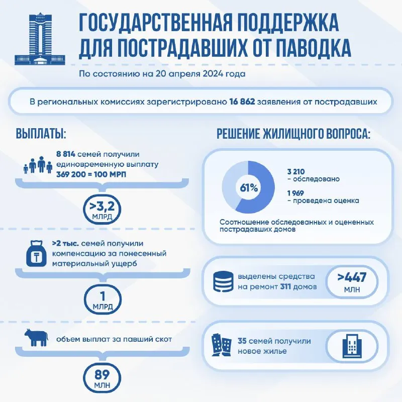 По состоянию на 20 апреля единовременную выплату в размере 100 МРП получили 8 814 семей на сумму около 3,2 млрд тенге. Более 2 тыс. семей получили компенсацию за понесенный материальный ущерб почти на 1 млрд тенге. Объем выплат за павший скот достиг 89 млн тенге.