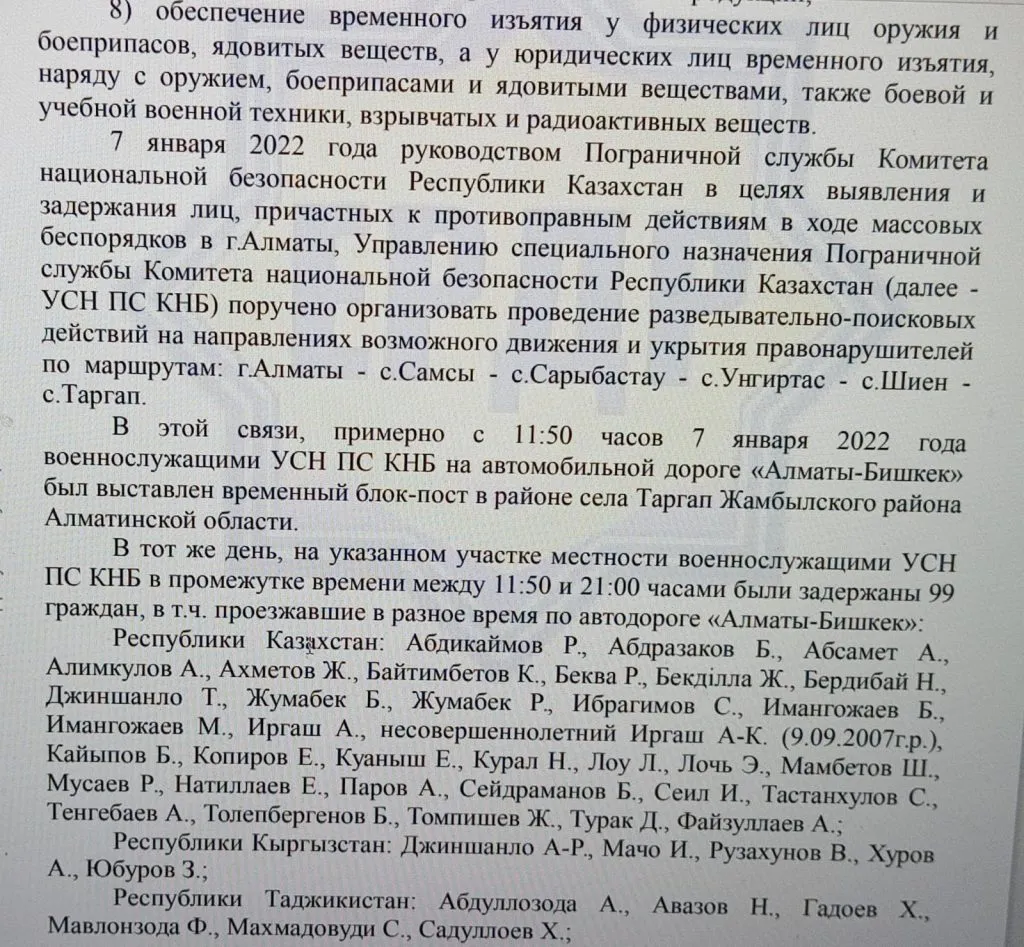 7 января руководство Погранслужбы КНБ поручило подчинённым организовать проведение разведывательно-поисковых мероприятий в квадрате пригорода Алматы и областных сёл Самсы, Сарыбастау, Унгиртас, Шиен и Таргап. Искали и задерживали лиц, причастных к массовым беспорядкам в Алматы.