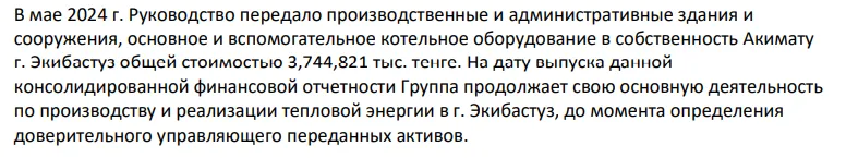 Спустя более полутора лет после аварии, в мае 2024 года, акимат Экибастуза снова получил активы от АО "ПАВЛОДАРЭНЕРГО". Только теперь стоимость имущества составляла 3,7 млрд тенге. Сюда входят производственные и административные здания, сооружения, основные и вспомогательные котельные. Можно предположить, что это всё, что есть на балансе ТОО "Экибастузэнерго".