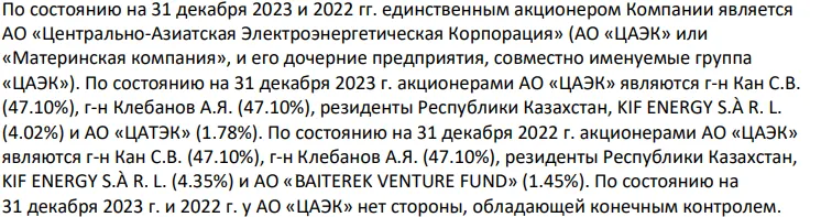 На сайте Казахстанской фондовой биржи (KASE) опубликовали аудиторский консолидированный отчёт градообразующего предприятия на 2023 год. Согласно документу, владельцем "ПАВЛОДАРЭНЕРГО" выступают Александр Клебанов (47,1% акций, №12 в списке Forbes на 2024 год), Сергей Кан (47,1% акций, №31 в списке Forbes на 2024 год), KIF ENERGY S.A.R.L. (4,02% акций, Люксембургская компания) и АО "ЦАТЭК" (1,78% акций, учредители АО "Центрально-Азиатская топливно-энергетическая компания" – Кан и Клебанова).
