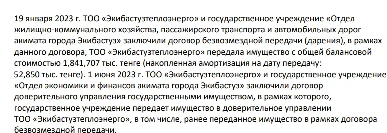 Сразу после первой аварии на ТЭЦ, общественность начала говорить о возвращении актива из владения казахстанскими миллиардерами. В январе 2023 года ТОО "Экибастузэнерго" и один из отделов акимата подписали договор дарения имущества на 1,8 млрд тенге. Учитывая амортизацию, стоимость активов едва превысила 52,8 млн тенге. Но уже в июле 2023 года госимущество снова отдали под управление "Экибастузэнерго". То есть, на бумаге активы были у отдела акимата, а на деле за него отвечали всё те же люди. При этом в документе не указали, что именно входило в дар.