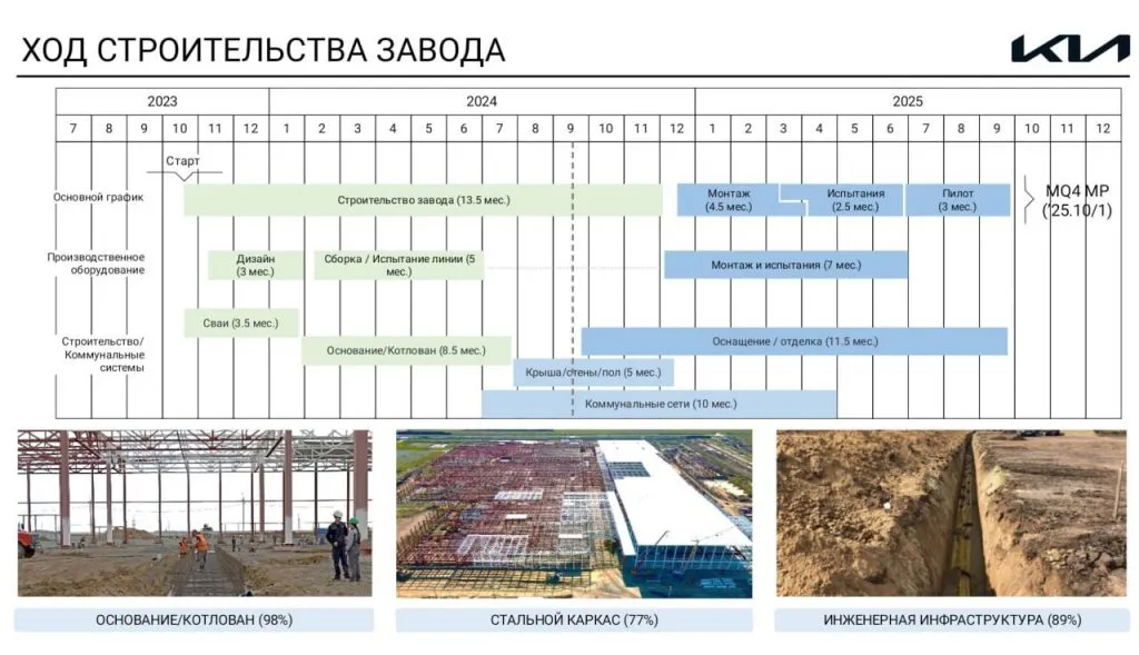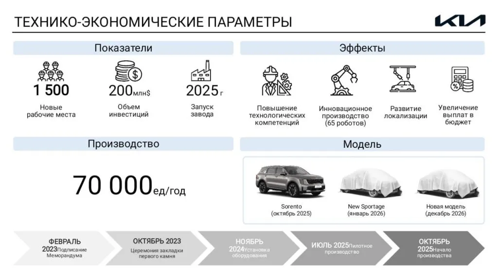 «В октябре 2025 года будет произведен пуск завода. На начальном этапе автопредприятие планирует производить модель Sorento. С января 2026 года начнется выпуск обновленной модели Sportage», — рассказал генеральный директор Kia Qazaqstan Ким Дэ Ки.