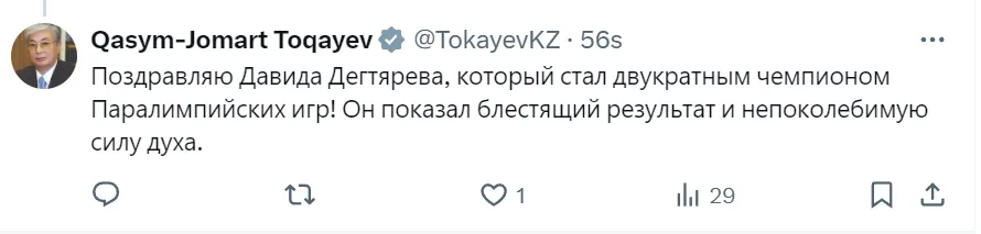 "Поздравляю Давида Дегтярева, который стал двукратным чемпионом Паралимпийских игр! Он показал блестящий результат и непоколебимую силу духа", – написал глава государства на своей социальной странице Х.