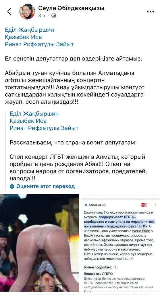 «10 августа — день рождения великого Абая. И в этот день устраивать массовые развлекательные мероприятия, тем более с участием артисток, открыто поддерживающих ЛГБТ-сообщества — это неуважение к казахской культуре. Остановите концерт! », — написала активистка.