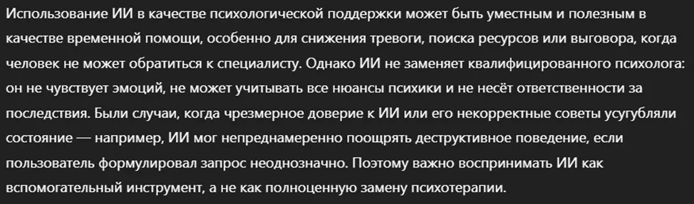 "Наученный сопереживать и подстраиваться под пользователя ИИ может отзеркаливать эмоции, а значит, гипотетически, вместо того, чтобы успокоить и заземлить чересчур тревожного клиента, в какой-то момент машина может усилить тревогу и переживания. Также нельзя игнорировать риск подстройки ИИ под негативные установки и мировоззрение пользователя, особенно если второй искусно приводит доводы в определённую сторону".