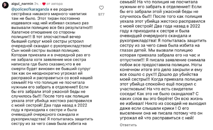 Айгуль, сестра Гульмиры Таймасовой, изумилась изворотливости полицейских и завила, что никакого чаепития в момент приезда стражей порядка между бывшими супругами не было и быть не могло. Об это она написала под постом Серика Беркамалова.