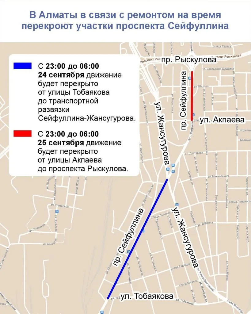С 23:00 до 6:00 25 сентября движение будет перекрыто от улицы Акпаева до проспекта Рыскулова. Объезд будет обеспечен по улицам Акпаева и Жансугурова.