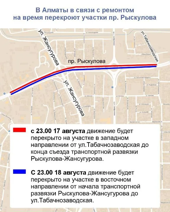 Движение будет перекрыто на участке в западном направлении от ул. Табачнозаводская до конца съезда транспортной развязки Рыскулова – Жансугурова с 23:00 17 августа до 11:00 19 августа.