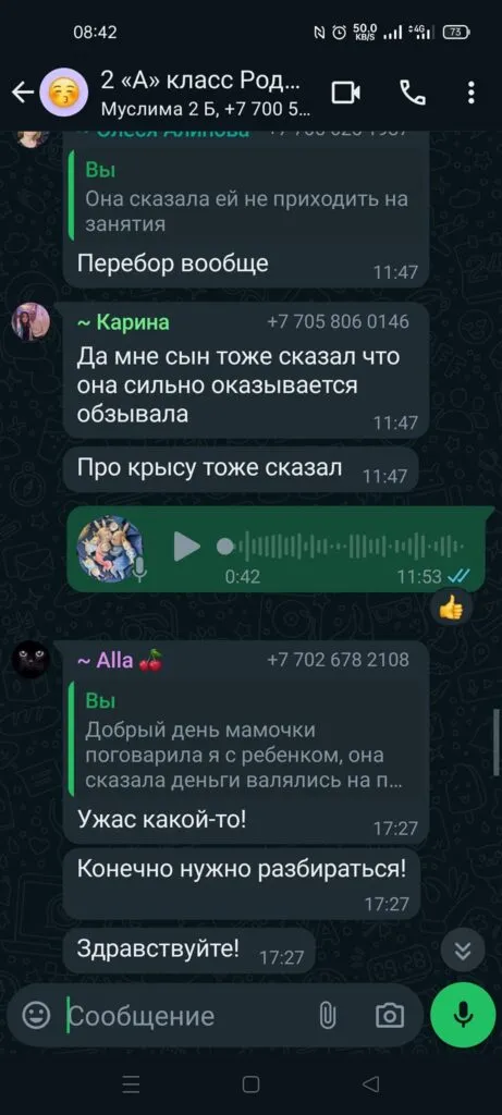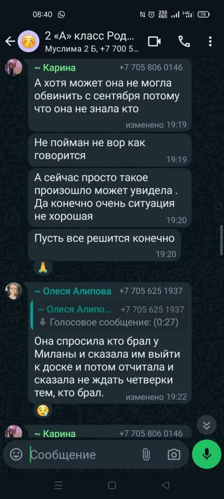 «6 мая мне позвонила учительница Гульбану Мирзахметовна и обвинила моего ребёнка в воровстве. Я сначала немного опешила, извинилась и спросила, как это всё произошло. Учитель заявила, что у неё в сумке лежали деньги, а когда она вышла из кабинета, они пропали. По её словам, в этот момент мой ребёнок раздавал другим детям какие-то деньги. Так, учительница собрала у всех детей деньги обратно и заявила о недостающих двух тысячах тенге. Я снова извинилась за ребёнка и возместила ей ущерб. После чего учительница пригрозила мне тем, что поставит мою дочь на учёт, ведь якобы мой ребёнок крадёт у неё средства ещё с сентября. Я спросила, почему она молчала до этого момента и не проводила собрание, но получила молчание в ответ»,