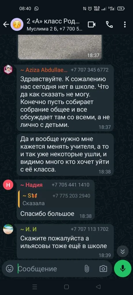 «Мою дочь она взяла за руку и перед всем классом назвала крысой. Учитель запретила ей приходить за занятия, надавила и заставила плакать. Все родители, которые беседовали с детьми в шоке, неоднократно наш классный руководитель обзывает и обижает детей. Дети подтверждают, то что Гульбану Мирзахметовна очень злостно отчитала ребёнка, далее я поговорила со своей дочкой и с другими родителями детей. Выяснилось, что дети нашли деньги под столом. Я не защищаю поступок своего ребёнка, мы проговорили и побеседовали на эту тему, но учитель не имел права без моего присутствия вести какие-либо действия в отношении моей дочери. Тем более выставлять на общее обозрение перед классом и обзывать крысой. Все дети испытывают стресс, не только мой ребёнок»,