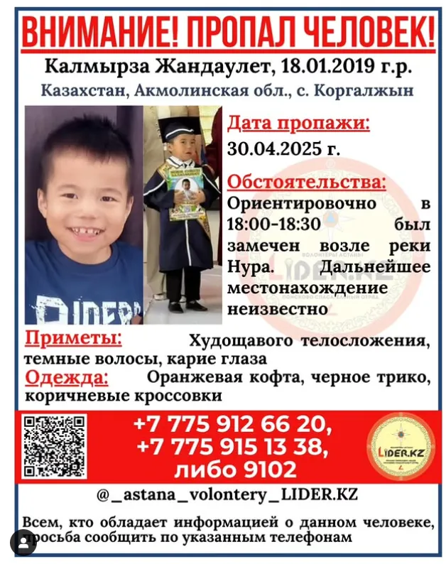 Около 18 часов местные дети видели его около руки Нура. Домой ребёнок не вернулся. 1 мая к поискам подключились волонтёры.