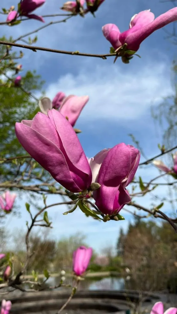 По соседству с грушей начали распускаться магнолии. Весной это один из наиболее красочных и ярких кустов в городе, ведь его украшают крупные нежно-розовые и белые бутоны.