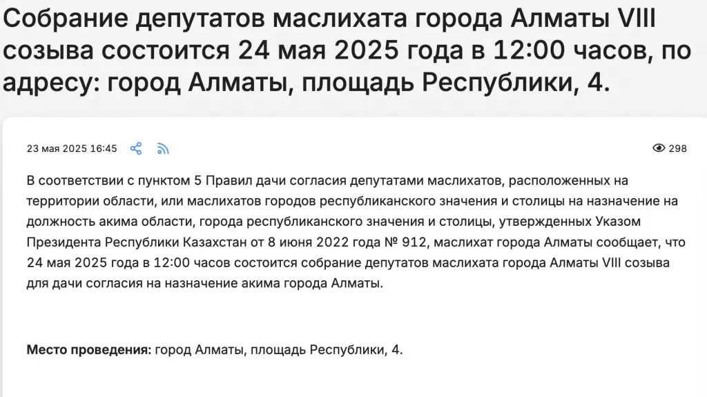 Собрание назначено на 12:00 и пройдёт в здании маслихата по адресу: площадь Республики, 4.
