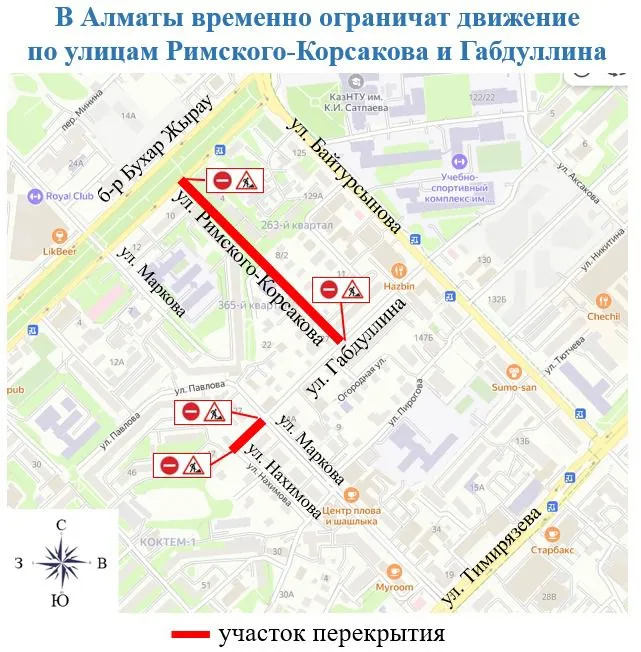 "Движение будет ограничено с 20 мая на улицах Римского-Корсакова (от Бухар-Жырау до Габдуллина) и на улице Габдуллина (от Нахимова до Маркова)".