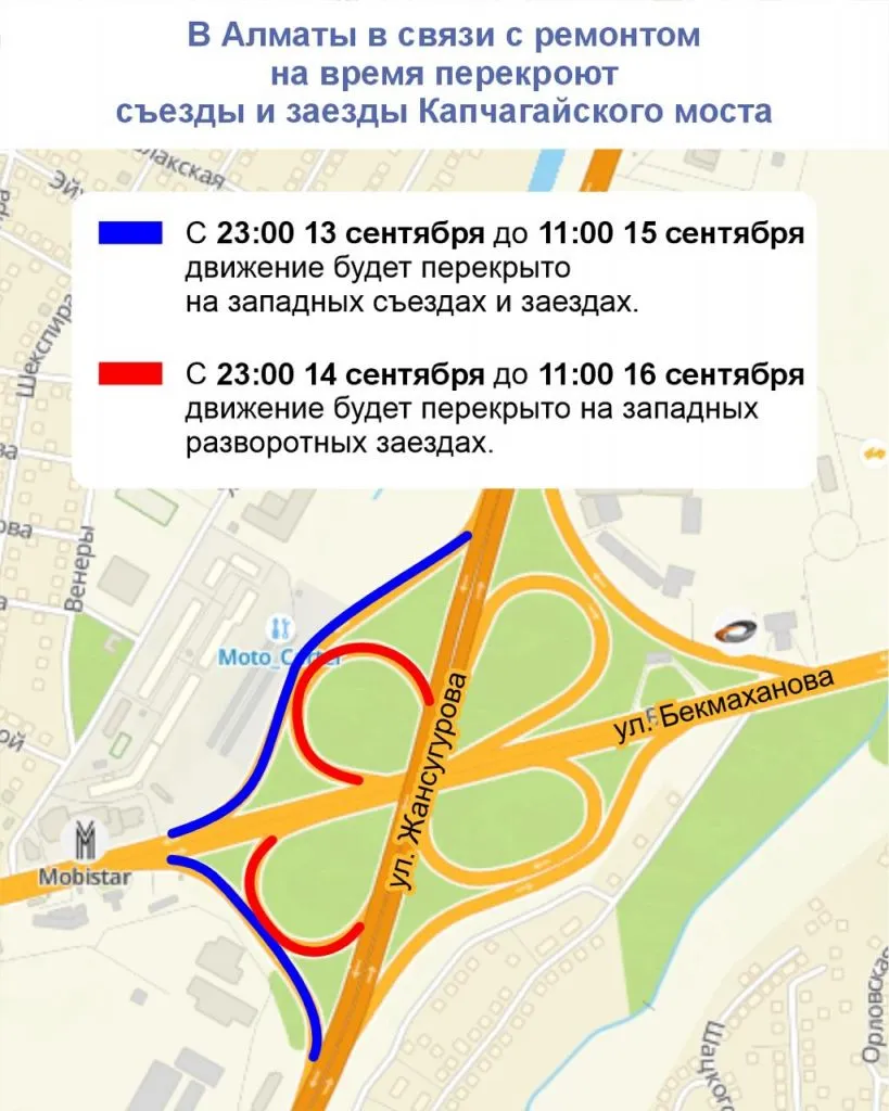 Первый участок: с 23:00 13 сентября до 11:00 15 сентября перекроют западные съезды и заезды. Объезд организован по улицам Бурундайская, Орлеу и Жайсан.