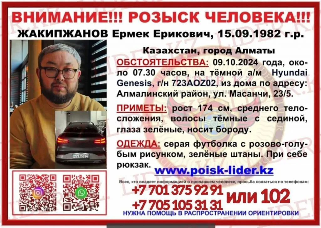 В Алматы больше суток ищут Ермека Жакипжанова. Утром он выехал из дома на собственном автомобиле и не вернулся, сообщает CMN.KZ