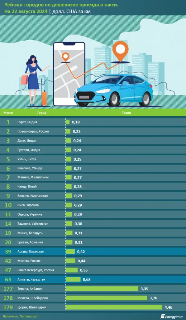 Что касается более тонкой разбивки по городам, самый высокий тариф среди городов стран СНГ был зафиксирован в Алматы: 0,68 долл. США за км. В столице Казахстана стоимость составила 0,42 долларов. Астана, на радость жителям города, уступила по дороговизне Москве и Санкт-Петербургу, где проезд в такси стоил 0,44 и 0,55 долларов США за км.