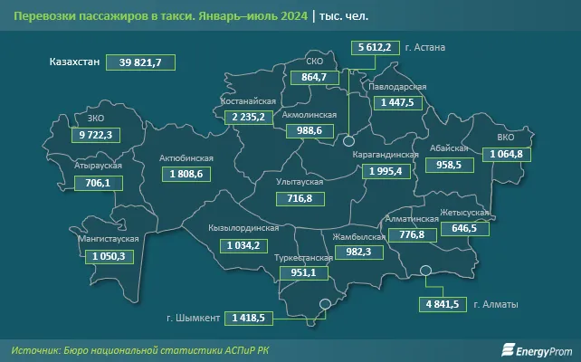 Всего с начала года в Казахстане услугами такси воспользовались 39,8 млн пассажиров — на 36,4% больше, чем годом ранее. Больше всего на такси ездят в ЗКО- 9,7 млн пассажиров. Далее идут Астана и Алматы: 5,6 млн и 4,8 млн пассажиров соответственно.