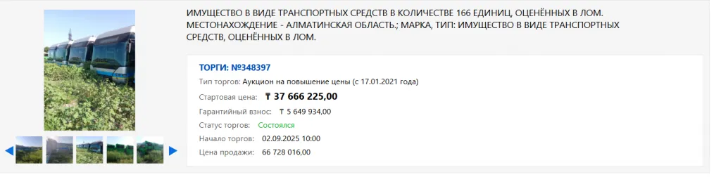 В июне 2025 года под Алматы уже продали одно «кладбище» автобусов. 573 транспортных единицы, не пригодных к использованию, обошлись неизвестному покупателю в 166 млн тенге при заявленной стартовой стоимости в 93,3 миллиона.