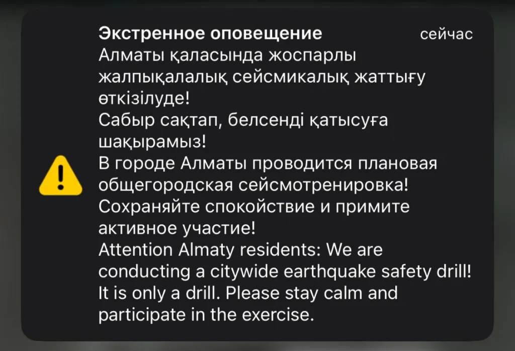 Предыдущая сейсмотренировка в Алматы прошла 17 октября 2024 года. Тогда в городе протестировали систему экстренного оповещения населения Mass Alert.