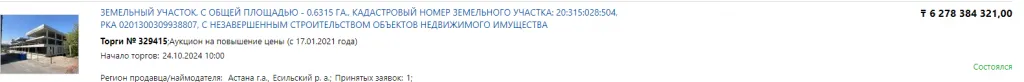 Несмотря на тот факт, что аукцион должен был проходить на повышение цены. Покупатель приобрёл его по стартовой стоимости – 6 278 384 321 тенге.