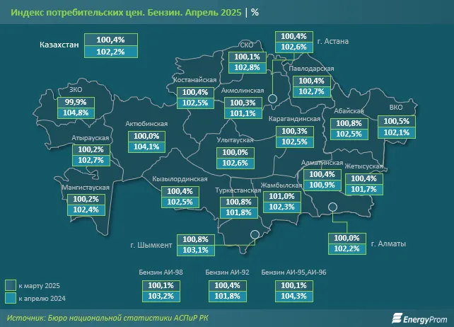 За год самый заметный рост цен на бензин зафиксировали в Западно-Казахстанской (на 4,8%) и Актюбинской (на 4,1%) областях, а также в Шымкенте (на 3,1%). Меньше всего стоимость выросла в Алматинской (на 0,9%), Акмолинской (на 1,1%) и Жетысуской (на 1,7%) областях.