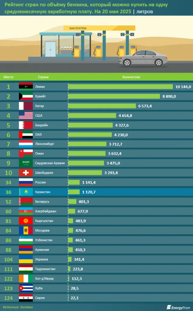 В рейтинге стран по объёму бензина, который можно приобрести на среднюю зарплату, по состоянию на 20 мая 2025 года, Казахстан занял 36-е место из 124. В РК на одну среднемесячную зарплату можно было купить 1,1 тыс. литров.