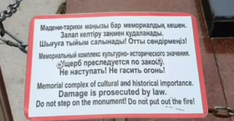 Вокруг «Вечного огня» в Караганде теперь установлены столбы, соединенные цепью. Рядом табличка на трех языках, объясняющая, что мемориальный комплекс имеет культурно-историческое значение. И его повреждение будет преследоваться по закону. Запрещено гасить огонь и наступать на него.