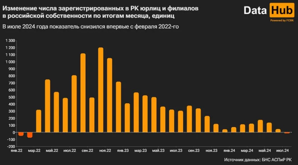 Сейчас в Казахстане число зарегистрированных организаций из РФ в два раза больше, чем было в довоенной реальности начала 2022 года. Действуют из них около 80%. И это число снижается уже по итогам трех месяцев подряд.