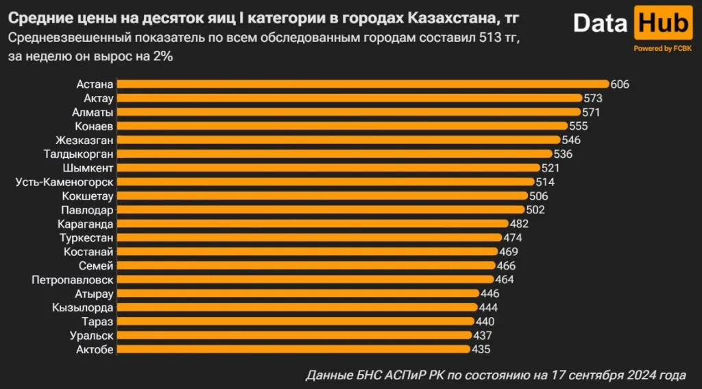 «В Жезказгане цены за семь дней выросли на 11,7%. В Улытау, кстати, всё не радужно с самообеспечением: региону, по некоторым оценкам, надо до 60 млн шт. яиц в год, а за 2023-й производство не дотянуло до 20 млн. Правда, ситуация должна измениться с возобновлением работы местной птицефабрики», – отмечают в бюро.