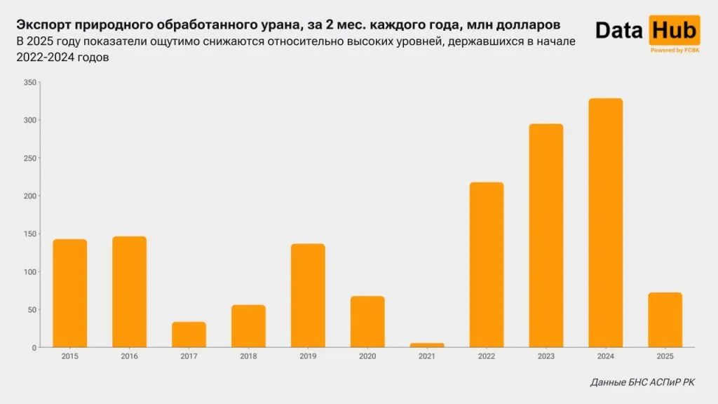 В статистике поставок за январь-февраль 2025 года фигурируют поставки за рубеж обработанного природного урана на 72,5 млн долларов, что на 78% меньше, чем было за те же месяцы 2024 года, передаёт CMN.KZ