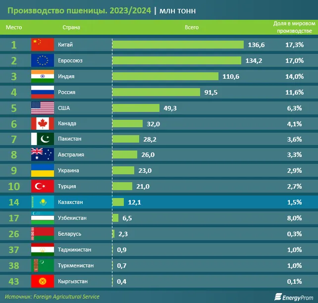Казахстан находится на 14 месте в мире по производству пшеницы. При этом страна теряет экспортные объёмы, сообщает CMN.KZ