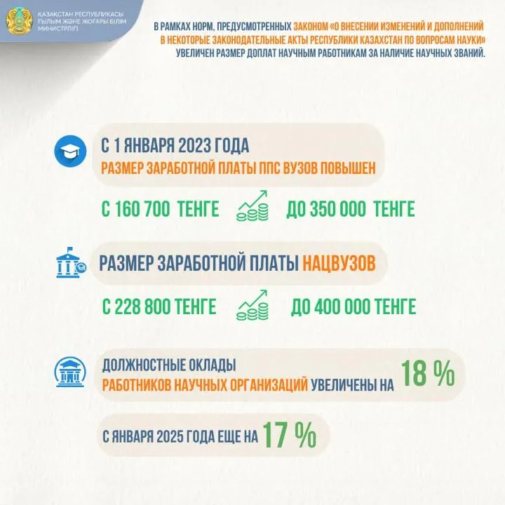 «С 1 января 2023 года должностные оклады работников научных организаций увеличены на 18%, с января 2024 года – на 18%, а с января 2025 года – на 17%. Также увеличили размер доплат научным работникам за наличие ученых званий и степеней», — говорится в сообщении ведомства