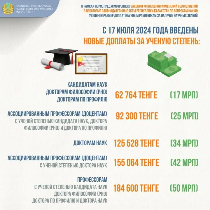«За наличие степени доктора философии (PhD), доктора по профилю, кандидата наук и ученого звания ассоциированного профессора (доцента) доплата будет составлять 25 МРП (92 300 тенге), а доктора наук и ученого звания ассоциированного профессора (доцента) – 42 МРП (155 064 тенге), за степень доктора философии (PhD), доктора по профилю, кандидата наук, доктора наук и ученое звание профессора – 50 МРП (184 600 тенге)», — уточнили в министерстве.