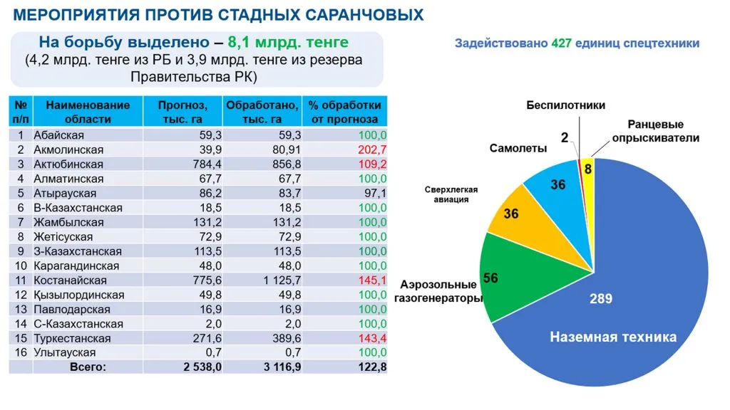 Общий объём обработанных площадей составил 3,1 млн га, что выше на 23% прогнозируемого в этом году показателя 2,5 млн га. Фактическое превышение прогнозного объёма сложилось в результате повторных обработок в местах, где выявлялись новые очаги распространения.