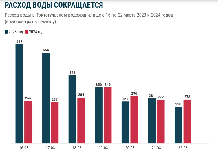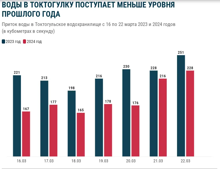 Одна из причин, почему так происходит, говорят специалисты, низкий приток воды. Если в прошлом году за третью неделю марта он в среднем составлял 222 кубометра в секунду, то в этом году — только 187. Однако с потеплением приток воды в водохранилище стал постепенно увеличиваться, хотя все еще находится ниже уровня 2023-го.