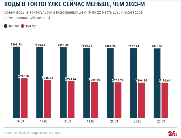 Водники отмечают, что с начала года уровень воды сократился на 3 миллиарда 233,08 миллиона кубометров. По сравнению с аналогичным периодом прошлого года воды меньше на 678,89 миллиона кубометров. В 2023-м объем воды в Токтогульском водохранилище удалось удержать на отметке в 7,8 миллиарда кубов. И ниже она не отпускалась. Впрочем, казахстанские аграрии уже тогда испытывали дефицит.