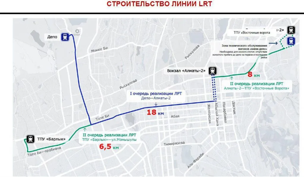 - в первую очередь линию проложат по улице Толе би до Абылай хана, далее — до железнодорожного вокзала Алматы-2, а также по улице Момышулы — от Толе би до Индустриальной зоны в Алатауском районе, где построят депо;